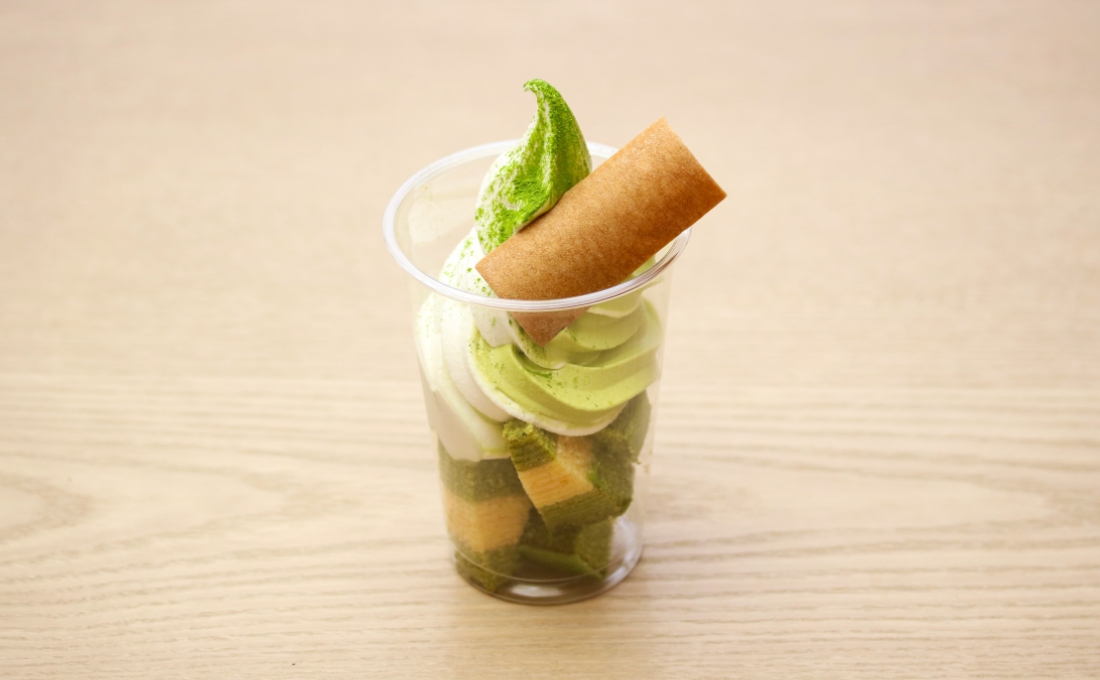 小さくカットした京ばあむの上に、ソフトクリームがたっぷり。抹茶、豆乳、ミックスの3種類からお選びいただけます。八ツ橋ですくって食べるのがオススメ。